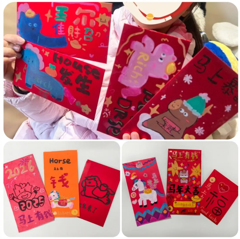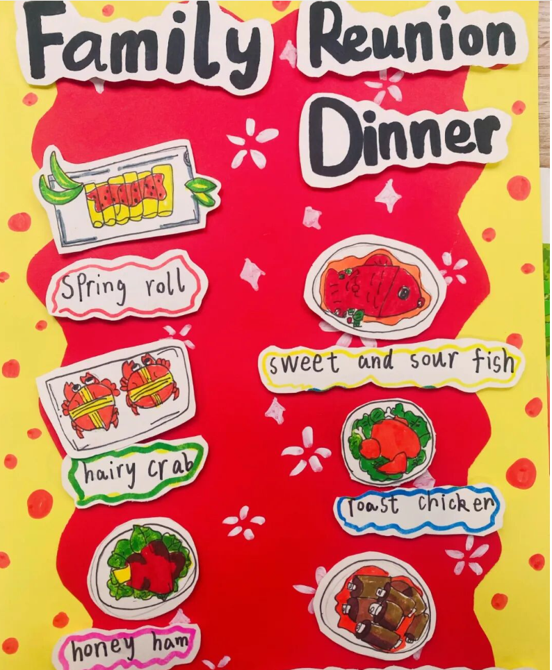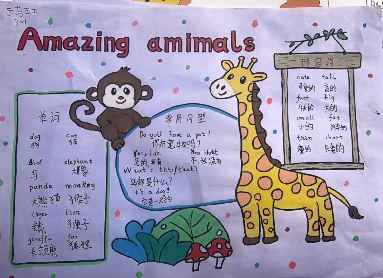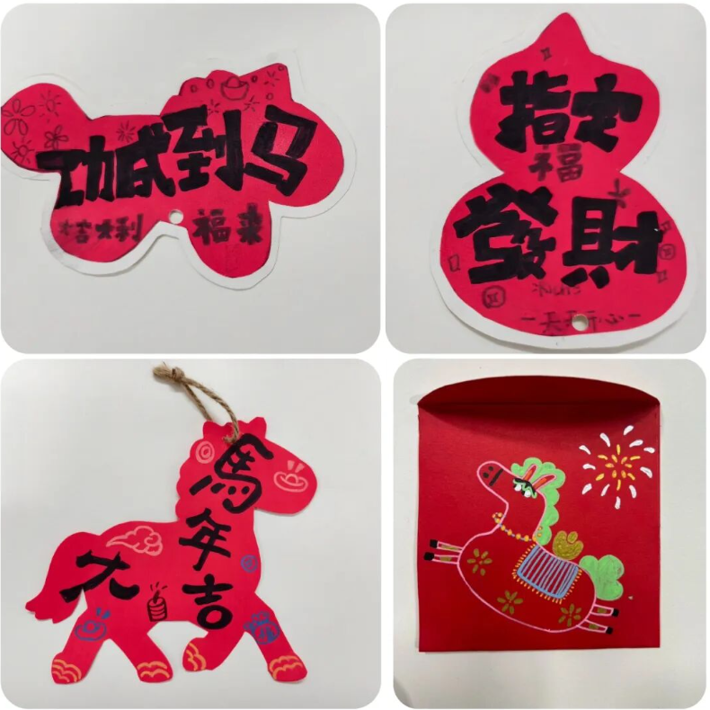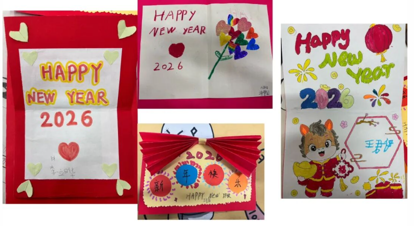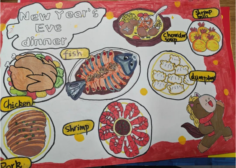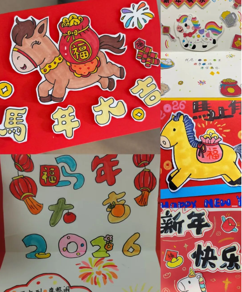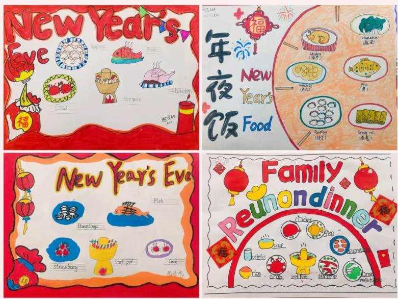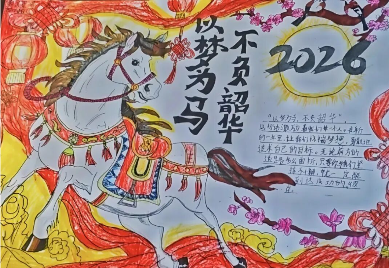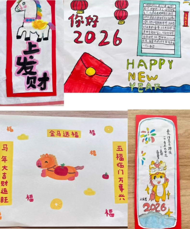 一张张英语手抄报色彩斑斓、布局精巧,有的以 “Happy Spring Festival” 为主题,用英语写下新年祝福;有的绘制卡通人物,配上简单的英语对话,童趣与创意并存。孩子们用行动证明,英语学习不仅是课本上的知识,更是敢于表达、乐于创造的快乐体验。