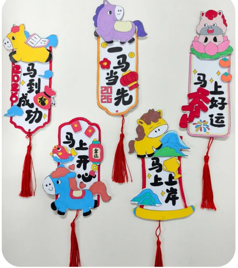 一张张自制书签堪称艺术品:有的用彩纸剪出小马的造型,呼应马年新春;有的用马克笔手绘卡通形象,搭配励志小短句;还有的利用树叶、干花做装饰,自然气息浓郁。每一枚书签都独一无二,既承载着对阅读的热爱,也展现了孩子们的审美与匠心。