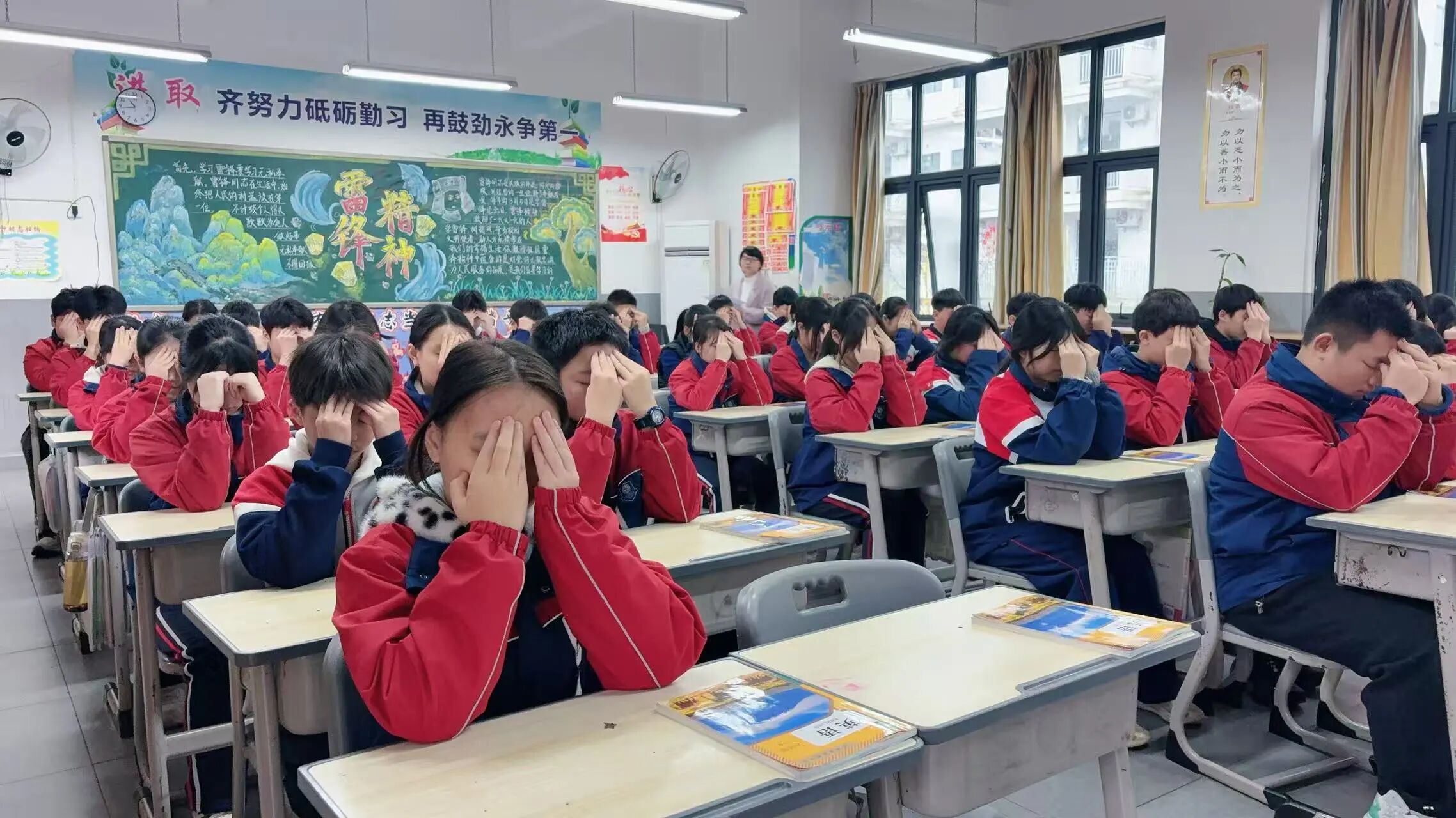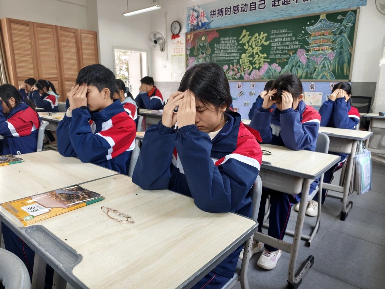 眼睛是心灵的窗户,呵护双眼,就是守护少年们的光明未来。眼保健操比赛环节,各班级同学坐姿端正、神情专注,严格按照标准动作,认真按压每一个穴位,从攒竹穴到太阳穴,从四白穴到风池穴,动作规范、力度适中,一丝不苟地完成每一个步骤。