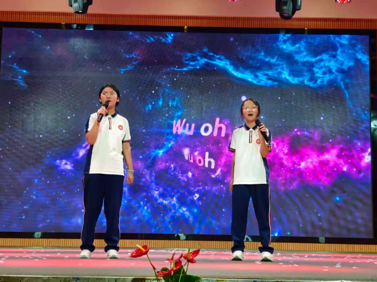 当灯光聚焦,少年们踏着节拍闪亮登场!802班张琬瑜和刘依萱的《抖音舞曲》活力满满,轻快旋律瞬间点燃全场气氛。