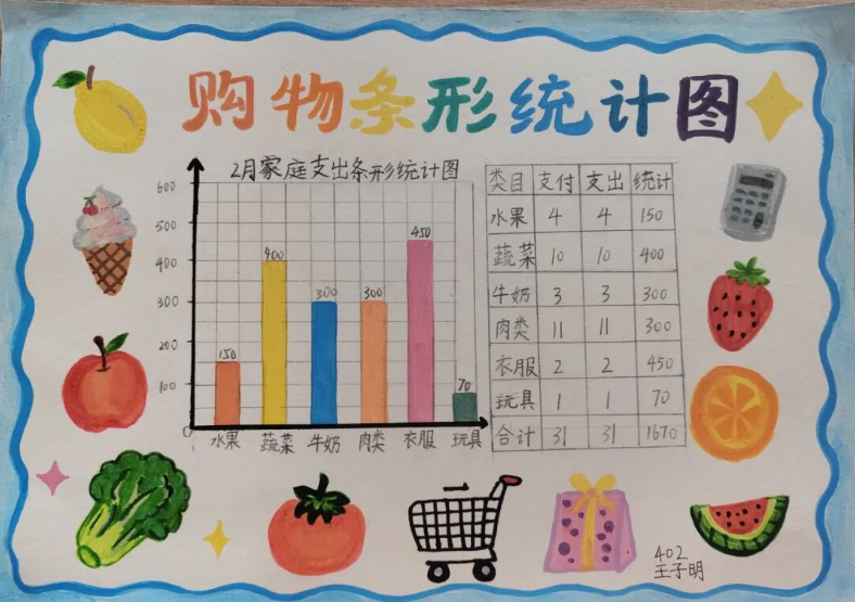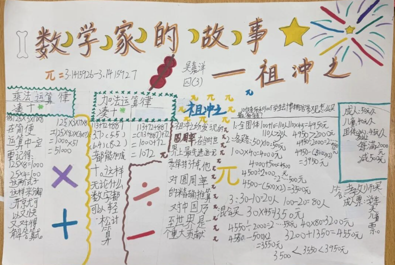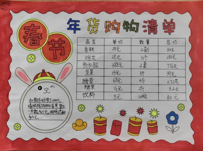 数学小报更是创意无限,有的以 “春节购物清单” 为主题,用加减法计算年货开销;有的用图形拼贴出新年图案,将数学知识与美术创意完美融合。
