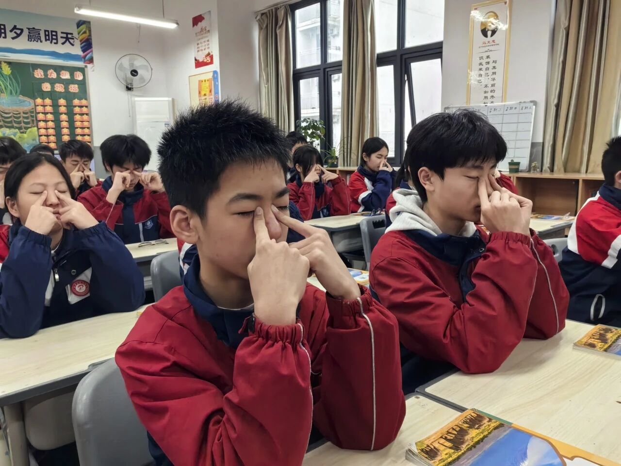 眼睛是心灵的窗户,呵护双眼,就是守护少年们的光明未来。眼保健操比赛环节,各班级同学坐姿端正、神情专注,严格按照标准动作,认真按压每一个穴位,从攒竹穴到太阳穴,从四白穴到风池穴,动作规范、力度适中,一丝不苟地完成每一个步骤。